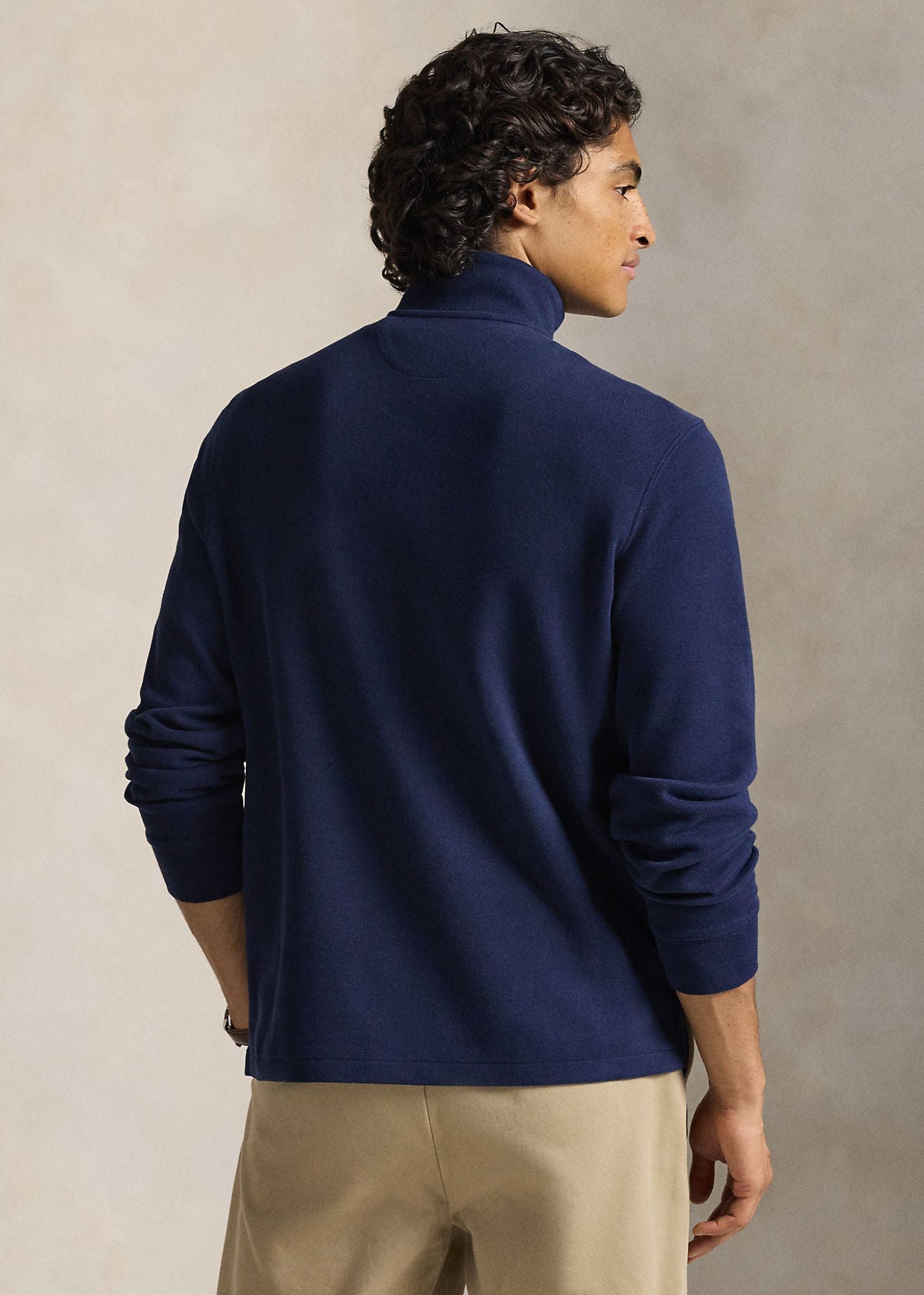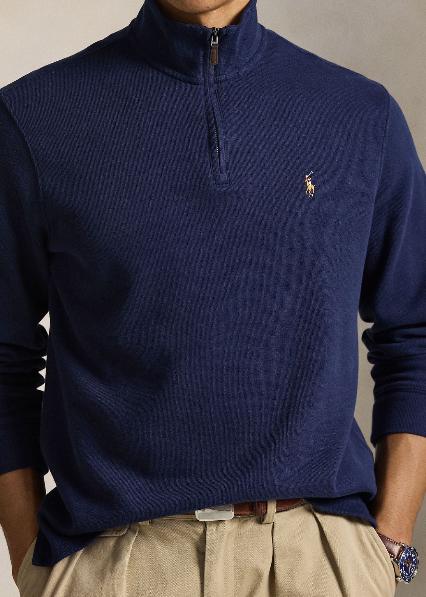 The pullover features a sleek mockneck with a quarter-zip placket, finished with a custom-developed zipper detailed with the iconic “Polo” logo. Long sleeves with banded cuffs and a vented hem provide a clean, tailored look, while the multicolored embroidered Polo Pony at the left chest adds a signature finish. Rendered in Cruise Navy, it offers timeless appeal suitable for both casual and smart-casual wear.